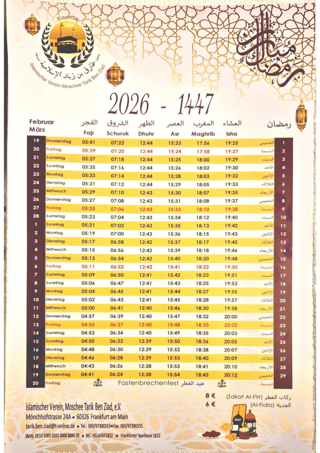 Die täglichen Gebetszeiten entnehmen Sie bitte unserer extra dafür eingerichteten Seite: [ Gebetszeiten der Tarik-Moschee ]
